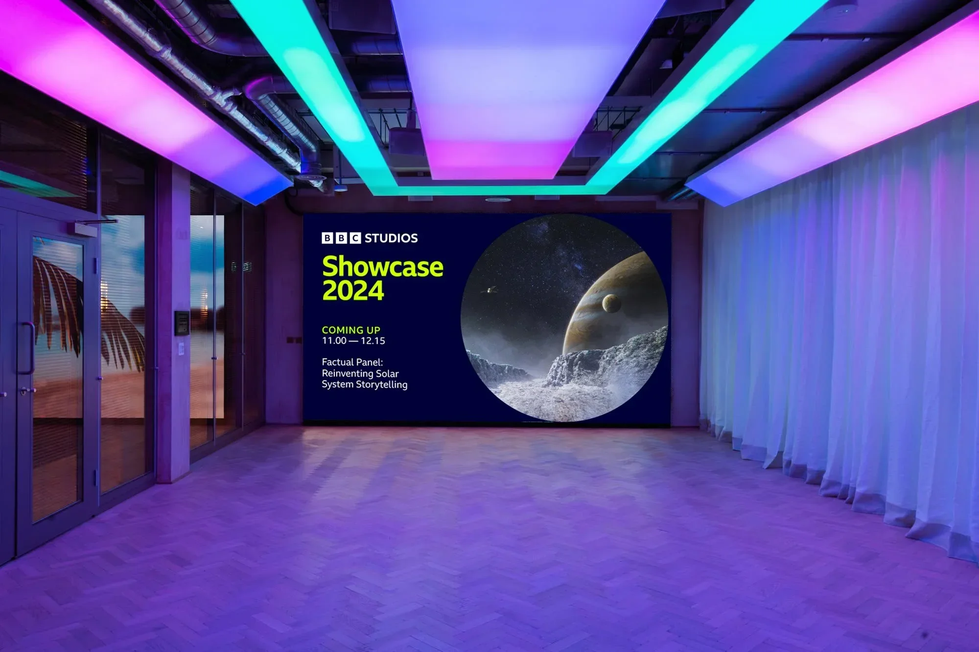 BBC Studios Showcase 2024 brought international partners and buyers to London for the company’s flagship industry event. At the centre of the venue stood a tall vertical screen designed to introduce the space and establish the visual tone of the evening.
