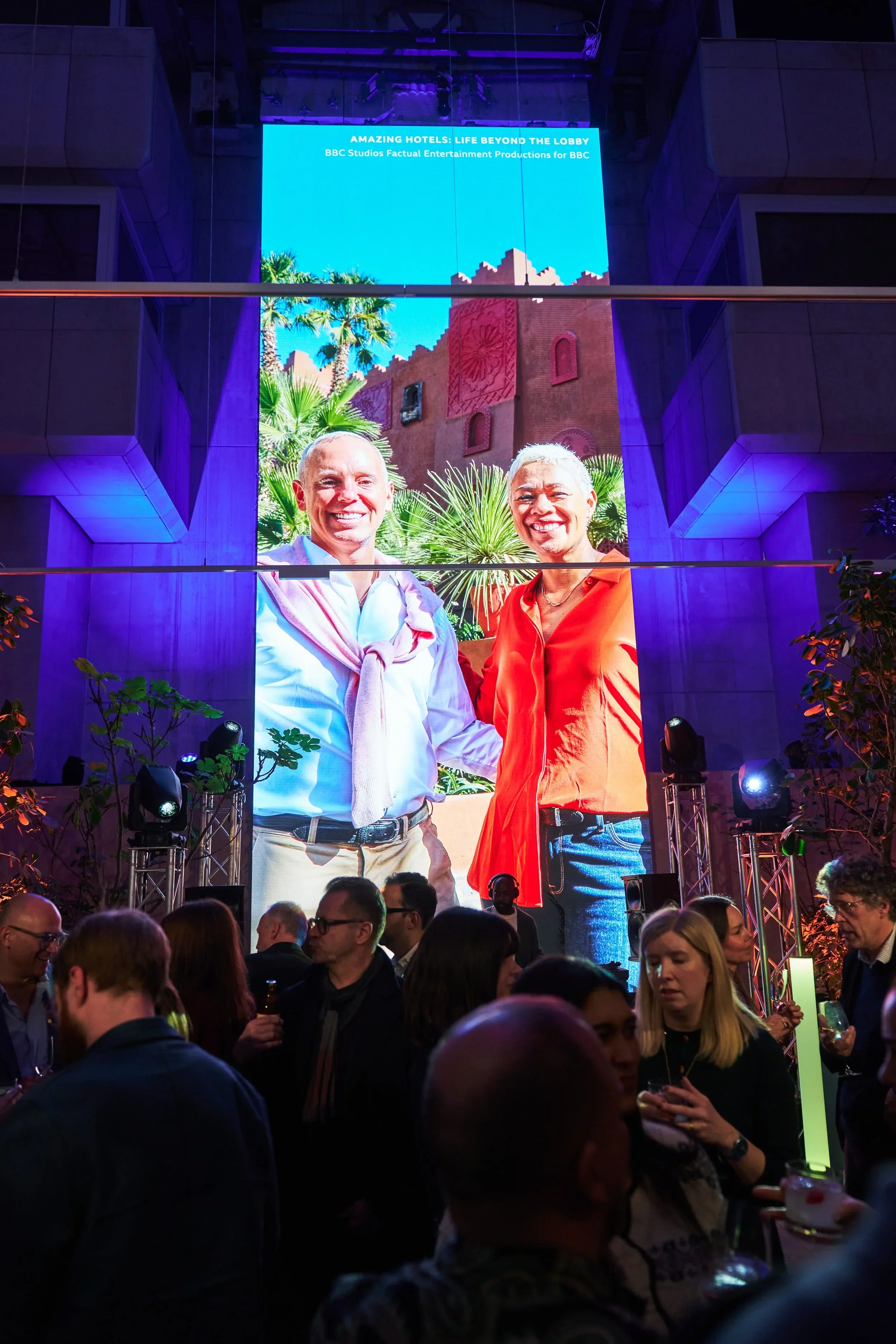 The motion content translated the BBC Studios brand into a large-scale screen experience that welcomed guests, carried ambient brand moments across the event, and later transitioned into more energetic visuals for the closing DJ set.